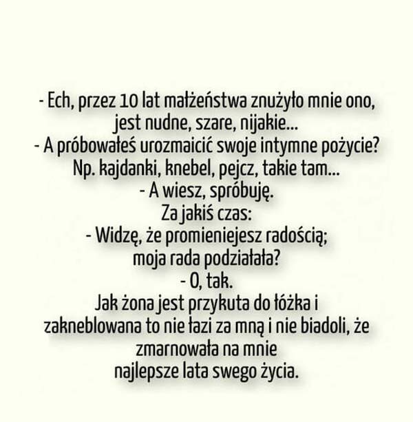Super! – Ech, przez 10 lat małżeństwa znużyło mnie ono, jest nudne, nijakie… :D